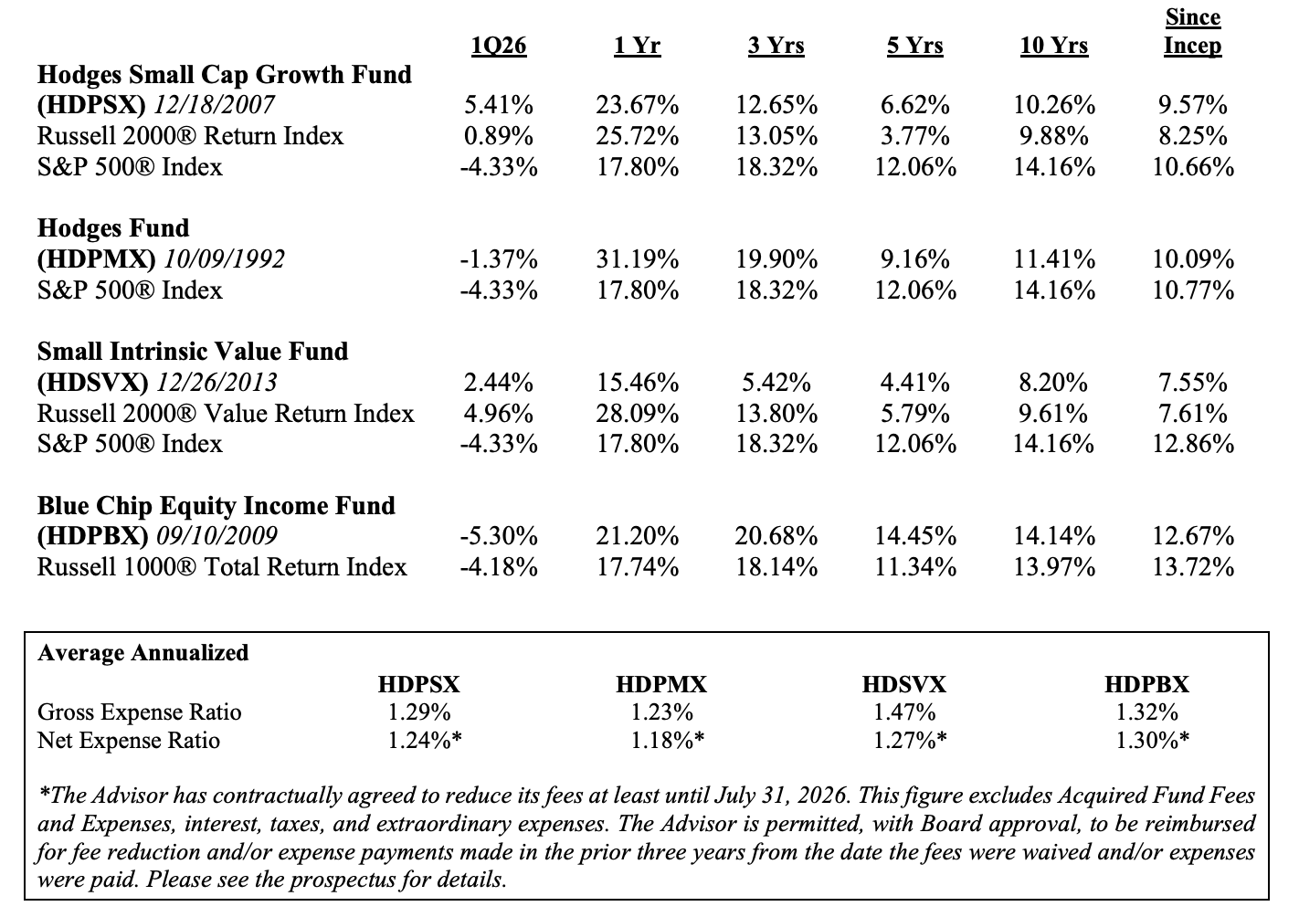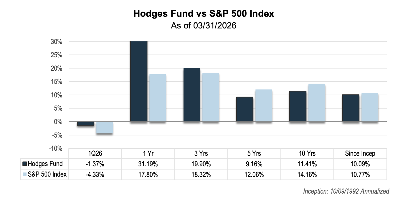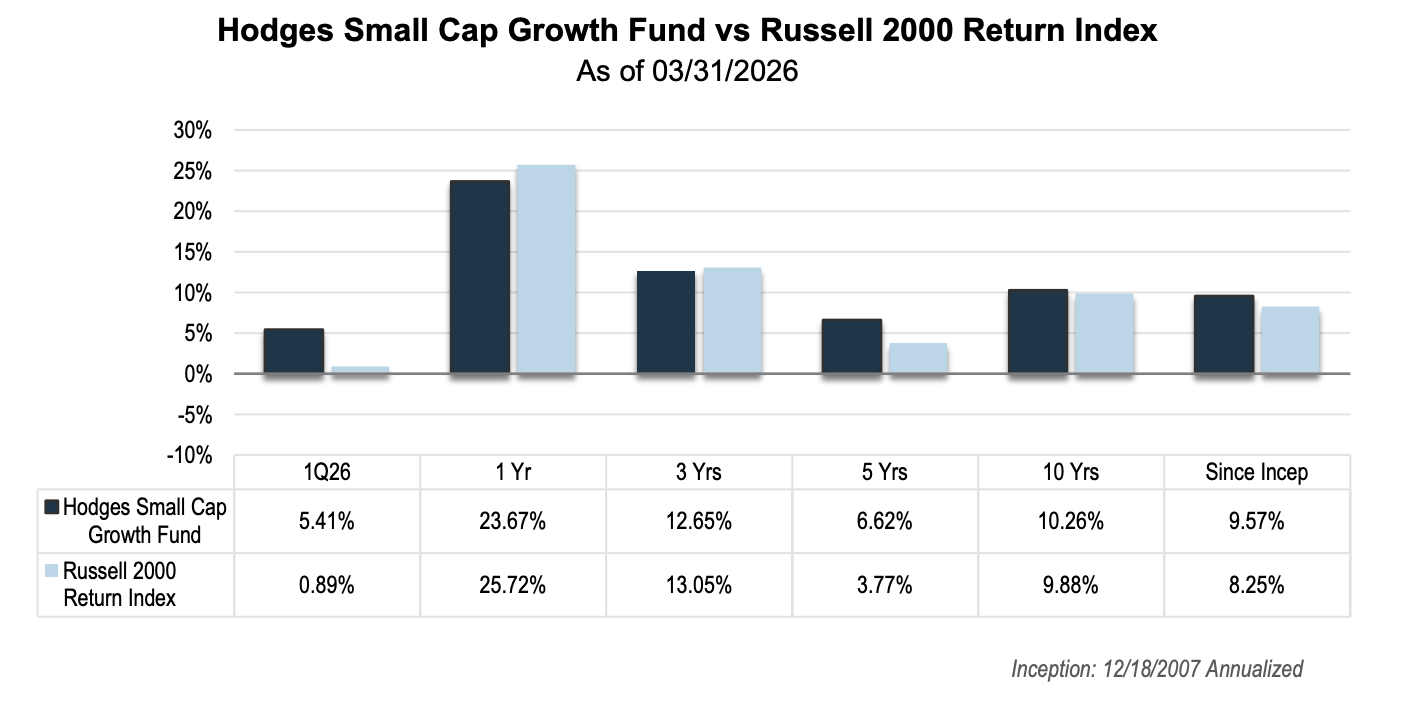 The return for the Hodges Small Cap Growth Fund amounted to a gain of 5.41% in the first quarter of 2026, compared to a 0.89% gain for the Russell 2000 Index. The Small Cap Growth Fund's 12-month return as of March 31, 2026, amounted to a gain of 23.67% compared to a gain of 25.72% for the Russell 2000 Index during the same period. Outperformance in the recent quarter reflected the fund's exposure to energy, infrastructure, and semiconductor stocks, which were the strongest contributors to the Russell 2000 performance in the first quarter of 2026. Although small-cap stocks have underperformed large-cap stocks for the better part of the past decade, we still consider the current risk-reward for holding quality small-cap stocks to be attractive. While small-cap stocks tend to experience greater volatility during market turmoil, we expect this segment to deliver above-average, risk-adjusted returns over the long term. Furthermore, many small-cap companies are uniquely positioned to benefit from deregulation, a pick-up in M&A activity, AI productivity enhancements, and the reshoring of manufacturing activity in the year ahead.
