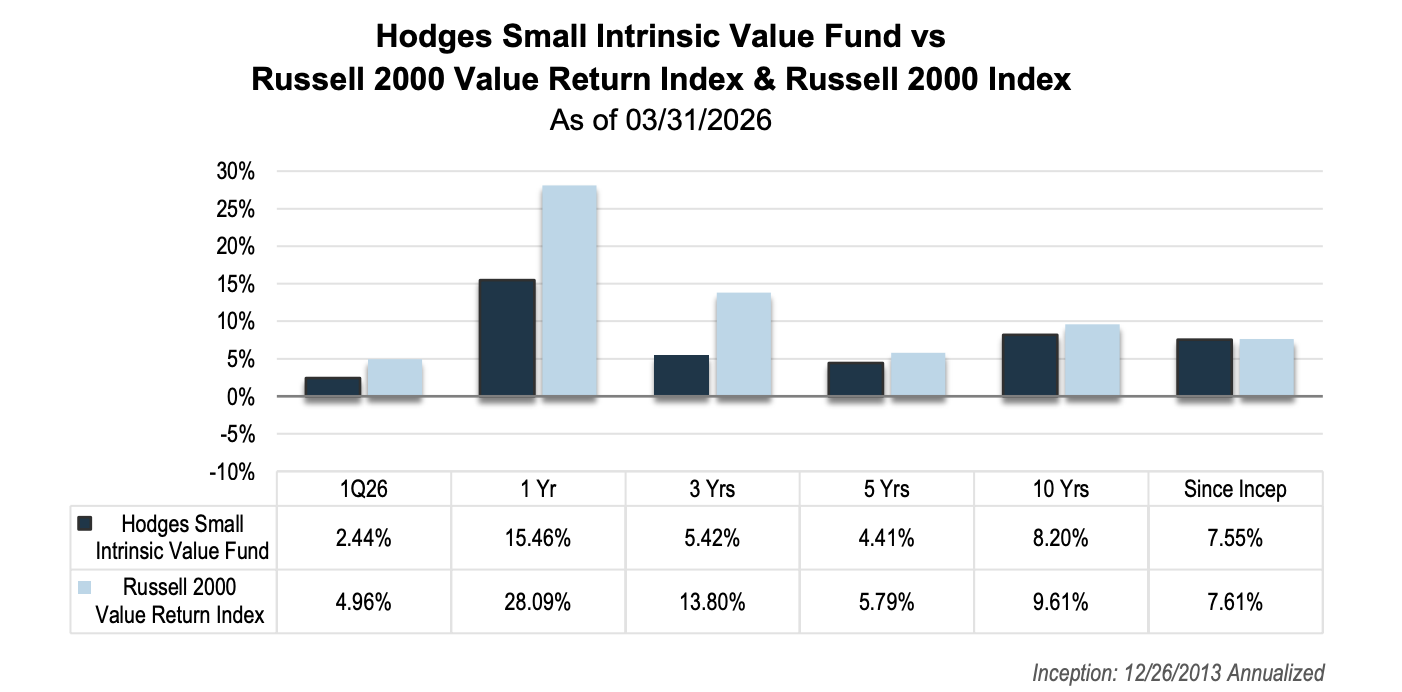 The Hodges Small Intrinsic Value Fund experienced a gain of 2.44% in the first quarter of 2026 compared to an increase of 4.96% for its benchmark, the Russell 2000 Value Index. The Small Intrinsic Value Fund's 1-year performance as of March 31, 2026, amounted to a gain of 15.46% compared to an increase of 28.09% for the Russell 2000 Value Index during the same period. The Fund's underperformance in both the first quarter and year, relative to the benchmark, has been due to weakness in consumer discretionary stocks and a lack of exposure to healthcare and biotech stocks. The number of positions held in the Fund at the end of the recent quarter was 44. As of March 31, 2026, the top holdings represented 35.84% of the Fund's assets. They included Academy Sports & Outdoors (ASO), Banc of California Inc (BANC), Bank Ozk (OZK), Texas Capital Bancshares (TCBI), Eagle Materials Inc (EXP), Gulfport Energy Operating Corp (GPOR), Citi Trends Inc (CTRN), Primoris Services Corp (PRIM), Matador Resources (MTDR) and Powell Industries Inc (POWL).