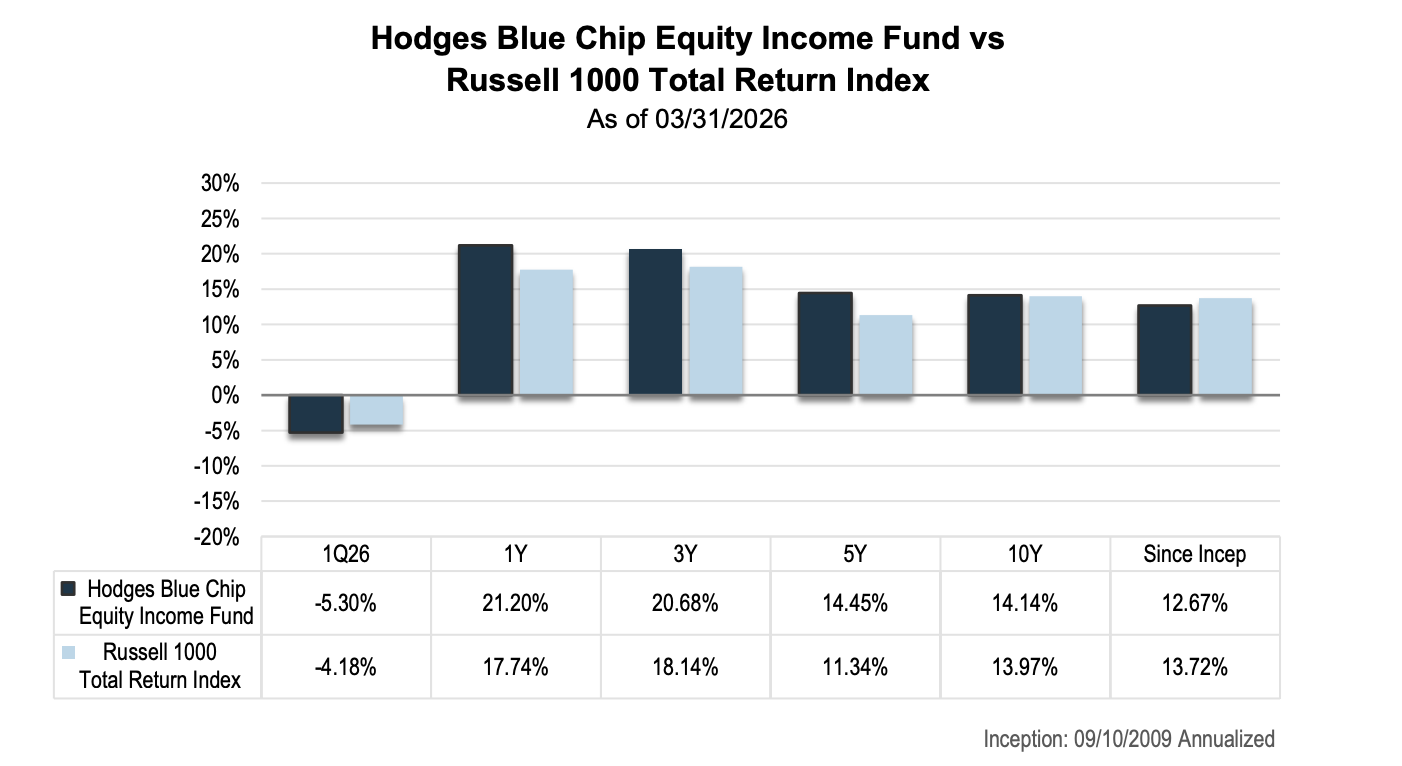 The Hodges Blue Chip Equity Income Fund experienced a loss of 5.30% in the first quarter of 2026, compared to a loss of 4.18% for its benchmark, the Russell 1000 Total Return Index. The Blue Chip Fund's 1-year performance as of March 31, 2026, amounted to a gain of 21.20%, compared to an increase of 17.74% for the Russell 1000 Index during the same period. We believe the current investment landscape offers ample opportunities among high-quality, dividend-paying stocks with solid upside potential. We expect underleveraged balance sheets and robust corporate profits across most blue-chip stocks to support stable dividend yields over the next several years. The Blue Chip Equity Income Fund remains welldiversified in companies that we believe can generate above-average income and total returns on a riskadjusted basis. The Fund held 30 positions at the end of the recent quarter. The top ten holdings at the end of the quarter represented 47.01% of the Fund's holdings and included Nvidia (NVDA), Walmart Inc (WMT), Broadcom Inc (AVGO), Apple Inc (AAPL), Citigroup Inc (C), Costco Wholesale Corp (COST), Boeing Co (BA), Goldman Sachs Group Inc (GS), Union Pacific Corp (UNP) and Morgan Stanley (MS).