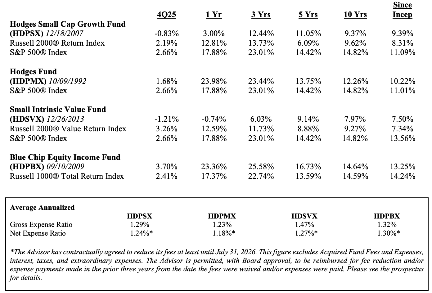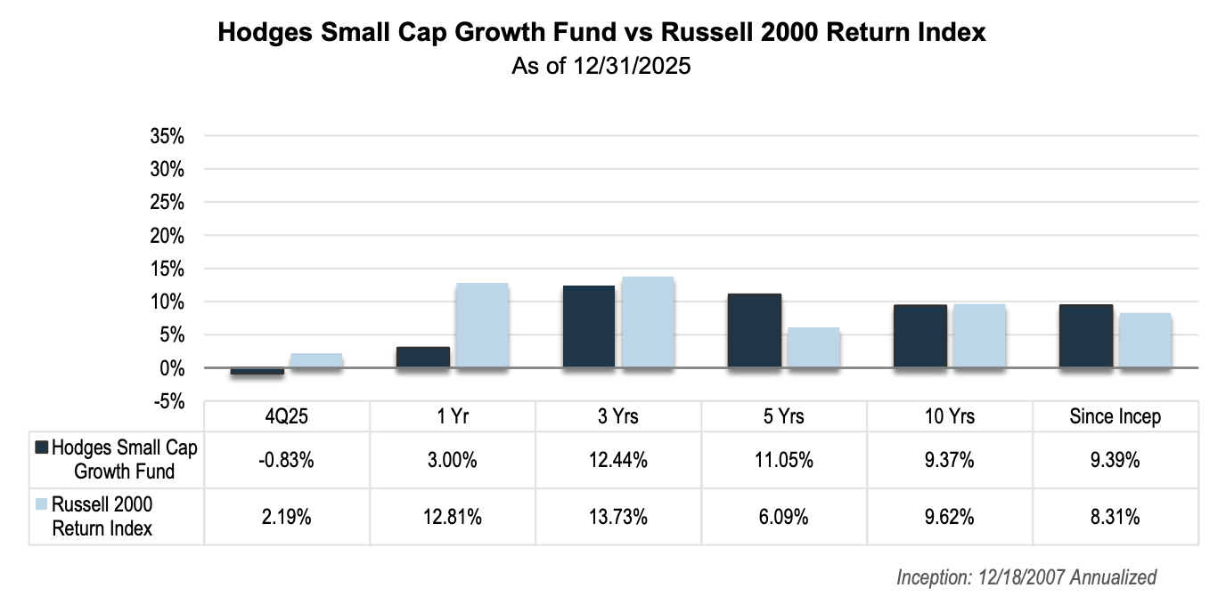 The return for the Hodges Small Cap Growth Fund amounted to a loss of 0.83% in the fourth quarter of 2025, compared to a 2.19% gain for the Russell 2000 Index. The Small Cap Growth Fund's year-to-date performance as of December 31, 2025, amounted to a gain of 3.00% compared to a gain of 12.81% for the Russell 2000 Index during the same period. Underperformance in the recent quarter and year reflected the funds lack of exposure to healthcare biotech, and enterprise technology stocks, which were the strongest contributors to the Russell 2000 performance in 2025. Although small-cap stocks have underperformed large-cap stocks for the better part of the past decade, we still consider the current risk-reward for holding quality small-cap stocks to be attractive. While small-cap stocks tend to experience greater volatility during market turmoil, we expect this segment to generate above-average relative riskadjusted returns over the long term. Furthermore, many small-cap companies are uniquely positioned to benefit from deregulation, a pick-up in M&A activity, AI productivity enhancements, and the reshoring of manufacturing activity in the year ahead.