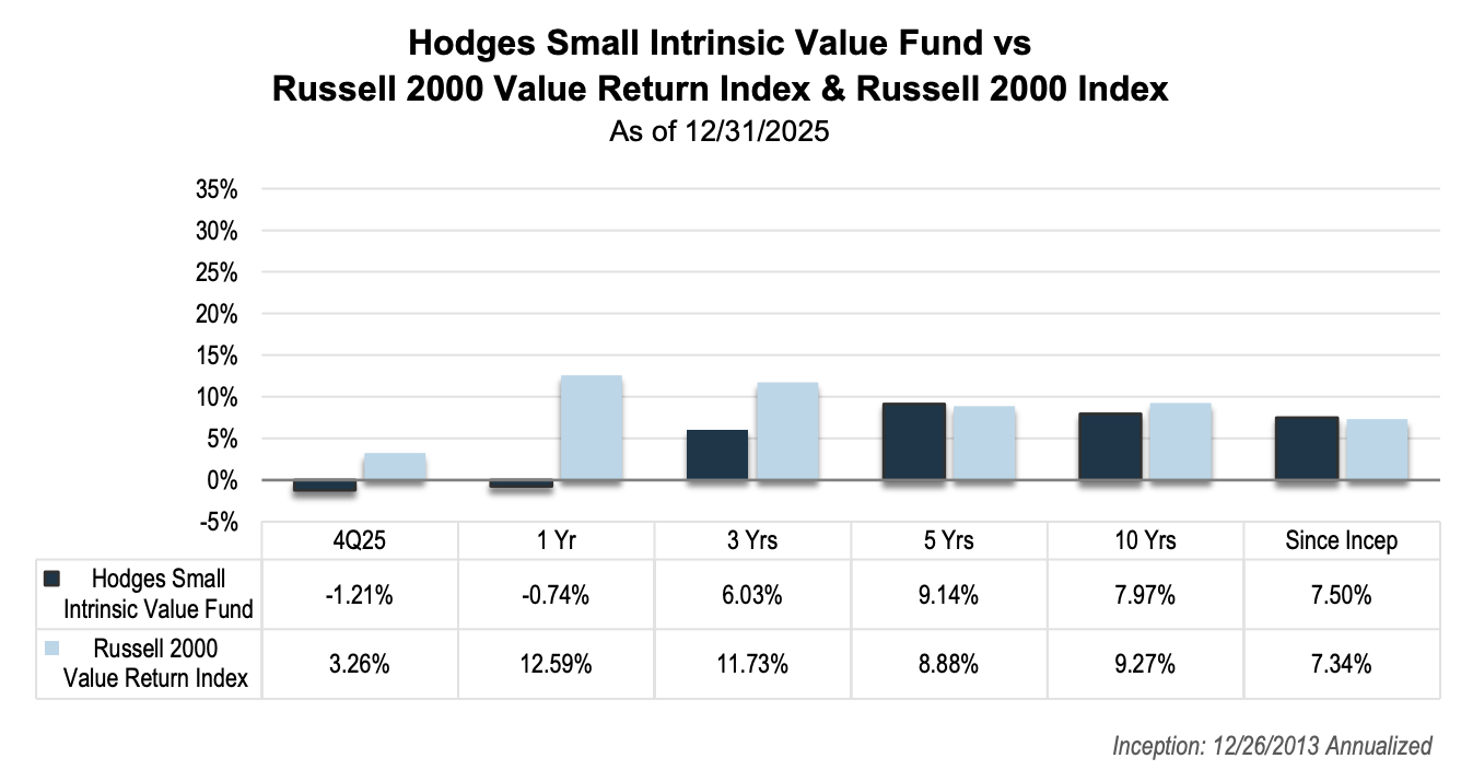 The Hodges Small Intrinsic Value Fund experienced a loss of 1.21 % in the fourth quarter of 2025 compared to an increase of 3.26% for its benchmark, the Russell 2000 Value Index. The Small Intrinsic Value Fund's year-to-date performance as of December 31, 2025, amounted to a loss of 0.74% compared to an increase of 12.59% for the Russell 2000 Value Index during the same period. The Fund's underperformance in both the fourth quarter and year relative to the benchmark has been due to weakness in consumer discretionary, materials, and energy stocks held in the porfolio. Lack of exposure to healthcare and biotech stocks also weighed on the portfolio’s relative performance. The number of positions held in the Fund at the end of the recent quarter was 42. As of December 31, 2025, the top holdings represented 38.83% of the Fund's assets. They included Academy Sports & Outdoors (ASO), Banc of California Inc (BANC), Bank Ozk (OZK), Gulfport Energy Operating Corp (GPOR), Eagle Materials Inc (EXP), Texas Capital Bancshares (TCBI), Commercial Metals Company (CMC), Cleveland-Cliffs Inc (CLF), Haverty Furniture (HVT), and Shoe Carnival Inc (SCVL).