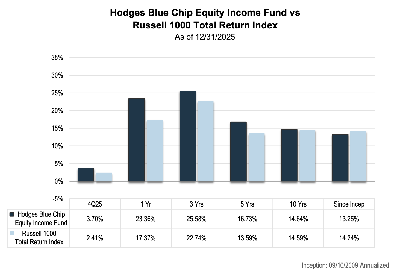 The Hodges Blue Chip Equity Income Fund experienced a 3.70% increase in the fourth quarter of 2025, compared to a 2.41% increase for its benchmark, the Russell 1000 Total Return Index. The Blue Chip Fund's year-to-date performance as of December 31, 2025, was a gain of 23.36%, compared to an increase of 17.37% for the Russell 1000 Index during the same period. Positive relative performance in the recent quarter was attributed to stock selection and sector allocation. We believe the current investment landscape offers ample opportunities among highquality, dividend-paying stocks with solid upside potential. We expect underleveraged balance sheets and robust corporate profits across most blue-chip stocks to support stable dividend yields over the next several years. The Blue Chip Equity Income Fund remains well-diversified in companies that we believe can generate above-average income and total returns on a risk-adjusted basis. The number of positions held in the Fund at the end of the recent quarter was 29. The top ten holdings at the end of the quarter represented 46.83% of the Fund's holdings and included Nvidia (NVDA), Broadcom Inc (AVGO), Apple Inc (AAPL), Walmart Inc (WMT), Citigroup Inc (C), American Express Co (AXP), Taiwan Semiconductor (TSM), Microsoft Corp (MSFT), Goldman Sachs Group Inc (GS), and Wells Fargo Company (WFC).
